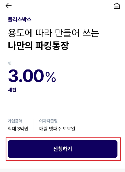 3. 나만의 파킹통장 연 3.0% (세전), 최대 3억 원까지 가입, 매월 넷째 주 토요일 이자 지급 확인하고 신청하기 버튼 클릭합니다.
