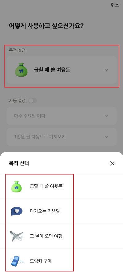 [급할 때 쓸 여윳돈]으로 기본 설정 되어있으니 변경 안 하셔도 됩니다.
