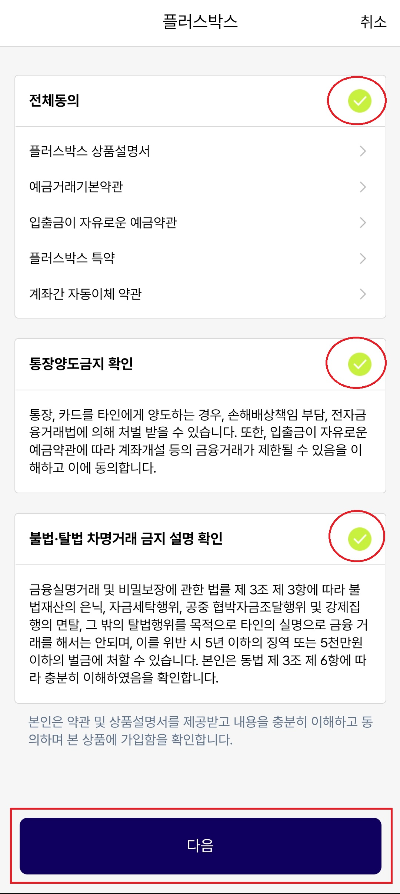 5. 약관 및 상품설명서 모두 동의 체크 하고 다음 클릭합니다.