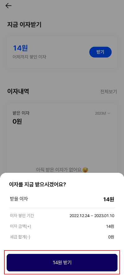 3. 한 번 더 현재 이자가 얼마인지 확인하는 화면이 나오는데 파란색 받기 버튼을 클릭합니다.