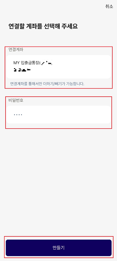 7. 연결계좌 확인하시고 비밀번호(4자리) 설정만들기 버튼 클릭합니다.