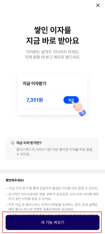 1. 플러스박스를 클릭하면 현재 잔고, 거래내역을 확인할 수 있고 중간에 지금이자받기를 클릭합니다.