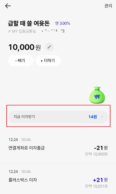 전 10,000원을 넣어놓은 상태고 지금 이자는 14원이네요^^