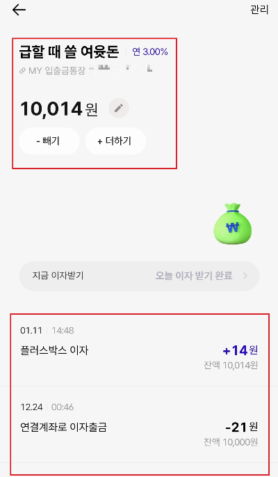 차이점이 보이시나요? 아래 거래내역에 보면 12월에 발생한 이자는 연결계좌로 출금되었는데 지금이자받기로 받은 이자는 다시 플러스박스로 입금되었어요. 이제 다음 달 이자는 10,000원이 아닌 10,014원에 대한 이자가 발생할 것입니다.