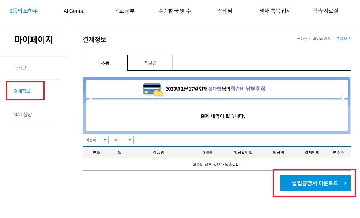 4. 왼쪽 결제정보 클릭 후 화면 중간에 납입증명서 다운로드를 클릭합니다.