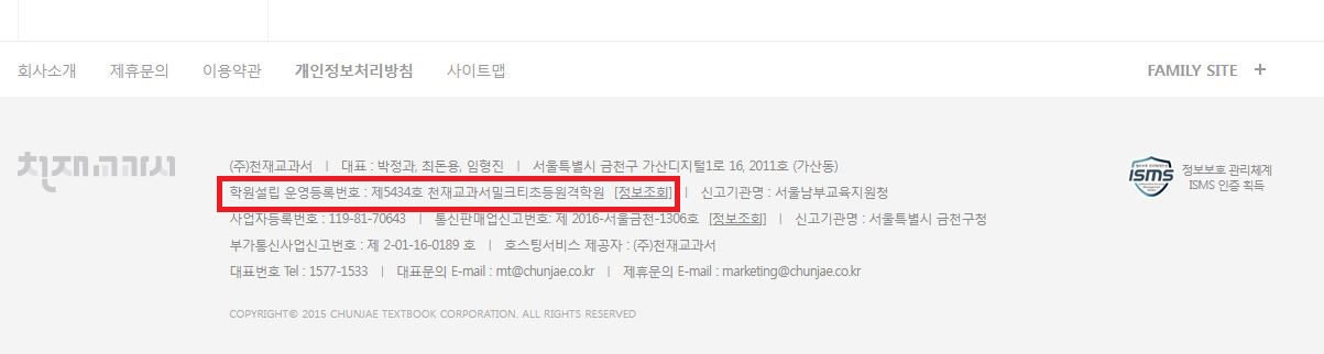 홈페이지 화면 맨 아래쪽에 학원설립 운영등록 번호가 적혀있습니다.