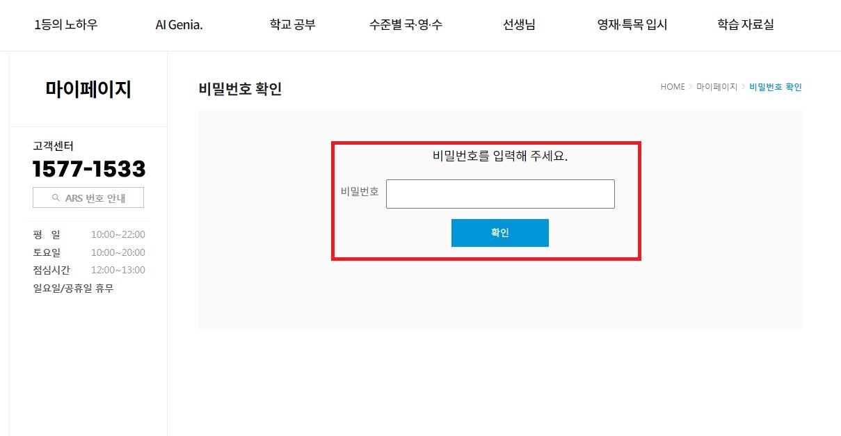 3. 마이페이지 화면에서 비밀번호를 한 번 더 입력하고 확인 버튼을 클릭합니다. (자녀 비밀번호)