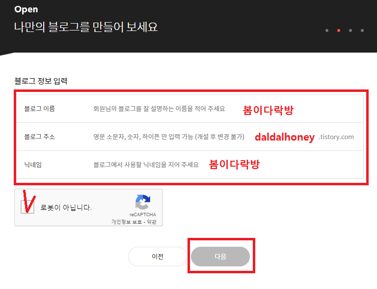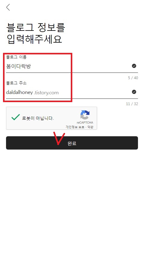PC에서 블로그 이름, 주소, 닉네임이 한 화면에 보여주고 입력했다면 모바일에서는 닉네임 입력하면 블로그 이름과 주소를 넣게끔 되어있습니다. 하지만 입력해야 되는 항목은 동일합니다.