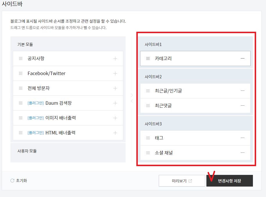 사이드바는 내 블로그 옆 쪽에 나타나는 메뉴를 설정할 수 있습니다.