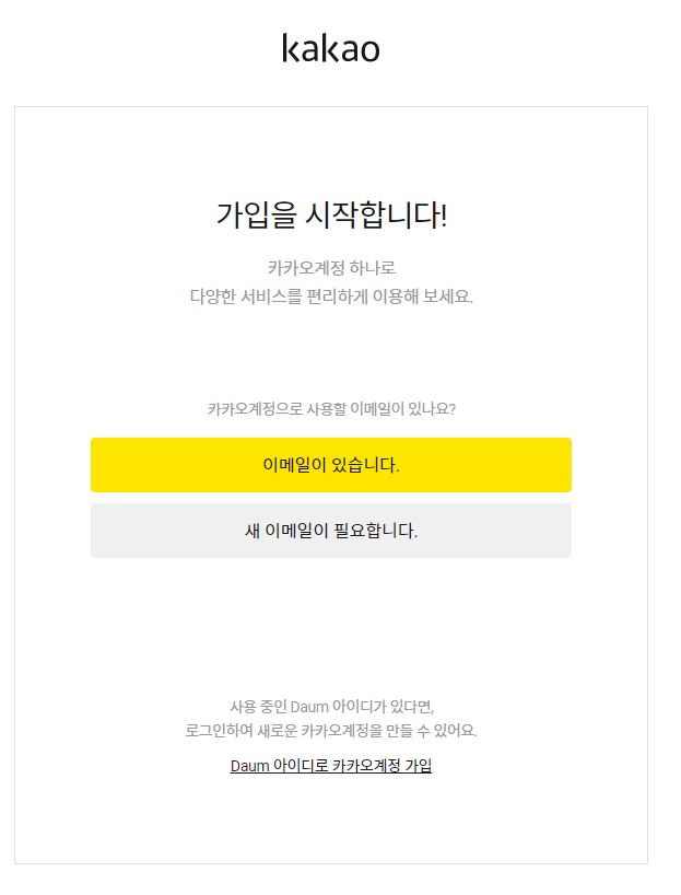 "카카오계정으로 티스토리 시작하기"를 눌려 들어가면 카카오 가입 화면으로 이동합니다. 카카오계정으로 사용할 이메일은 꼭 다음 메일이 아니어도 되고 지메일, 네이버 등도 가능합니다. 기존에 사용하는 메일을 계정으로 만들고 싶으면 "이메일이 있습니다." 새로운 메일을 다시 만들고 싶다면 "새 이메일이 필요합니다."를 눌러주면 되는데 기존에 사용하는 새 메일을 만들면 메일 생성 과정이 추가가 되기 때문에 기존에 가지고 있는 메일을 카카오계정으로 연결하는 것이 좋습니다.