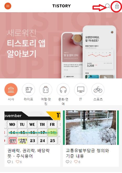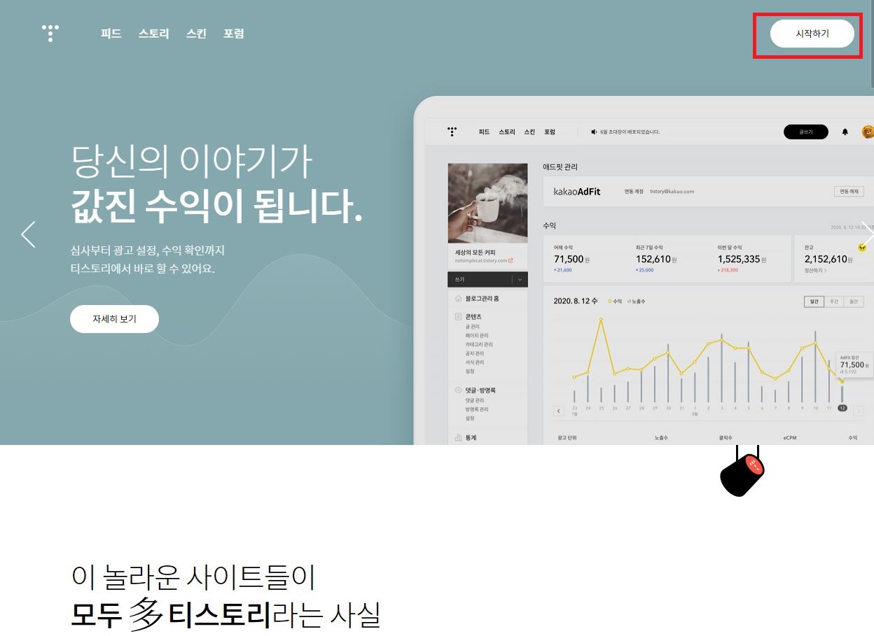 티스토리 홈페이지 오른쪽 상단 "시작하기 " 클릭해 주세요. 모바일에서는 "자물쇠 모양"입니다.