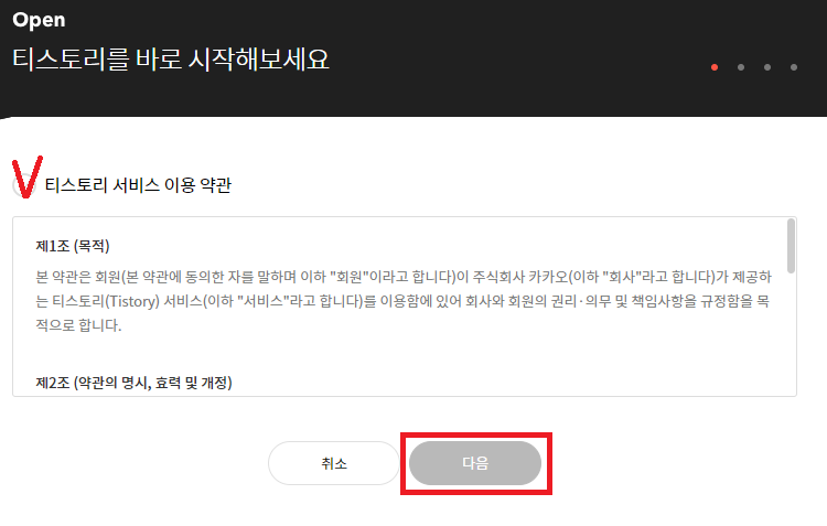카카오계정으로 로그인했다면 이제 블로그를 만들어 볼 텐데요. 티스토리 서비스 이용 약관 클릭 후 다음으로 넘어갑니다.
