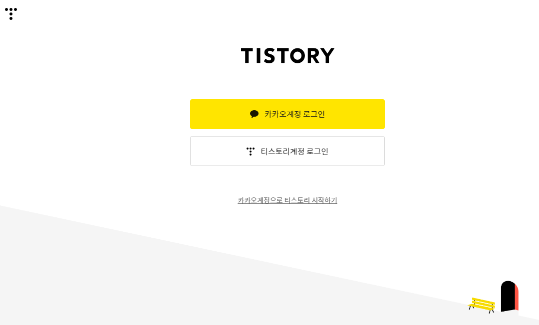 티스토리는 카카오계정으로 회원가입 가능합니다. 카카오계정이 있다면 "카카오계정 로그인"으로 회원가입을 해주시면 되고 만약에 카카오계정이 없다면 "카카오계정으로 티스토리 시작하기"를 눌러 진행하면 됩니다.