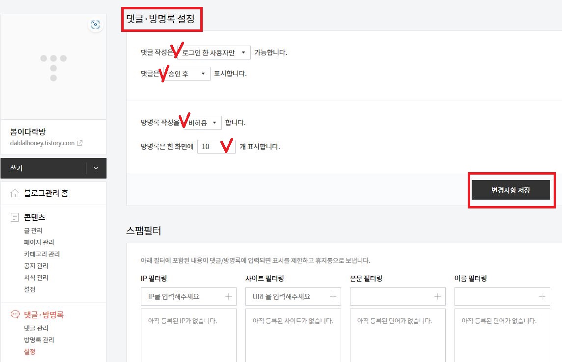 왼쪽 목록 중 댓글. 방명록 - 설정을 클릭하여 아래와 같이 설정 후 [변경사항 저장]